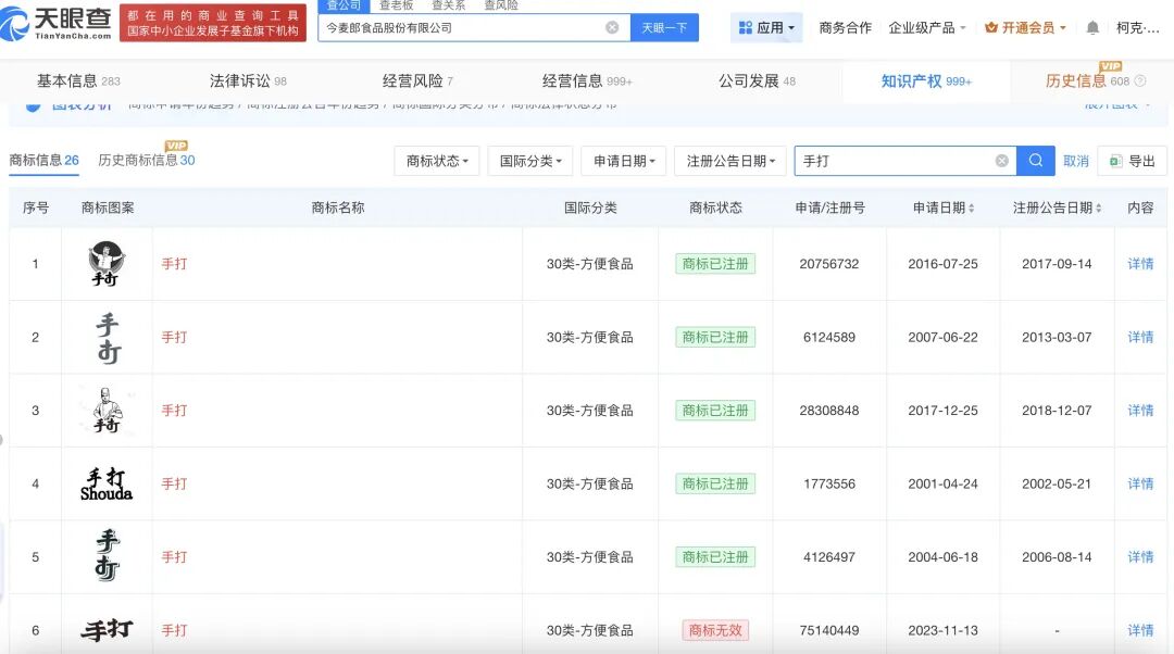 据天眼查知识产权信息显示,今麦郎食品股份有限公司在2004年到2023年间陆续注册了多个“手打”字样的商标,属于方便食品系列。