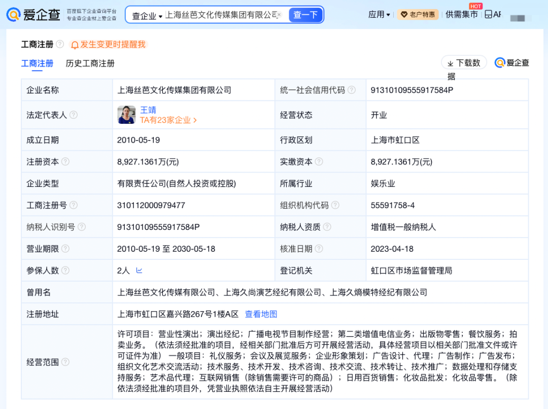 爱企查App显示,丝芭传媒关联公司丝芭文化传媒集团有限公司成立于2010年5月,法定代表人为王靖,注册资本约8927万元人民币,经营范围包括营业性演出、演出经纪、广播电视节目制作经营等。股东信息显示,该公司由王靖、上海星澈创业投资合伙企业(有限合伙)、北京创新方舟科技有限公司等共同持股。年报信息显示,该公司2025年参保人数为2人。
