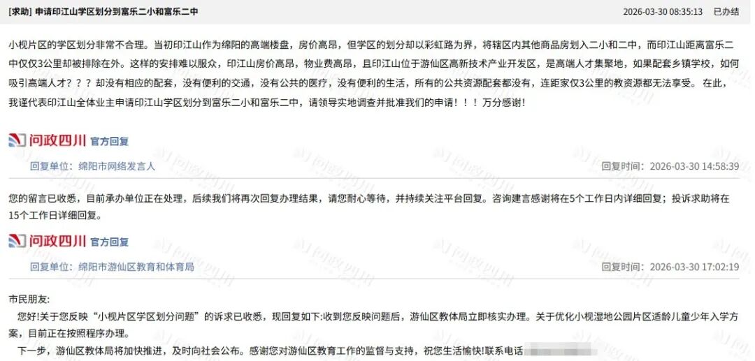同在2025年,该局也回复过何时将该校周边小区纳入该校服务范围的问题:后期,待该校本部大校额、大班额得到化解,游仙区教育布局得到优化,区教体局将报经区政府同意,会同相关部门统筹考虑小枧湿地公园片区(该校周边区域)适龄儿童少年就近入学问题。