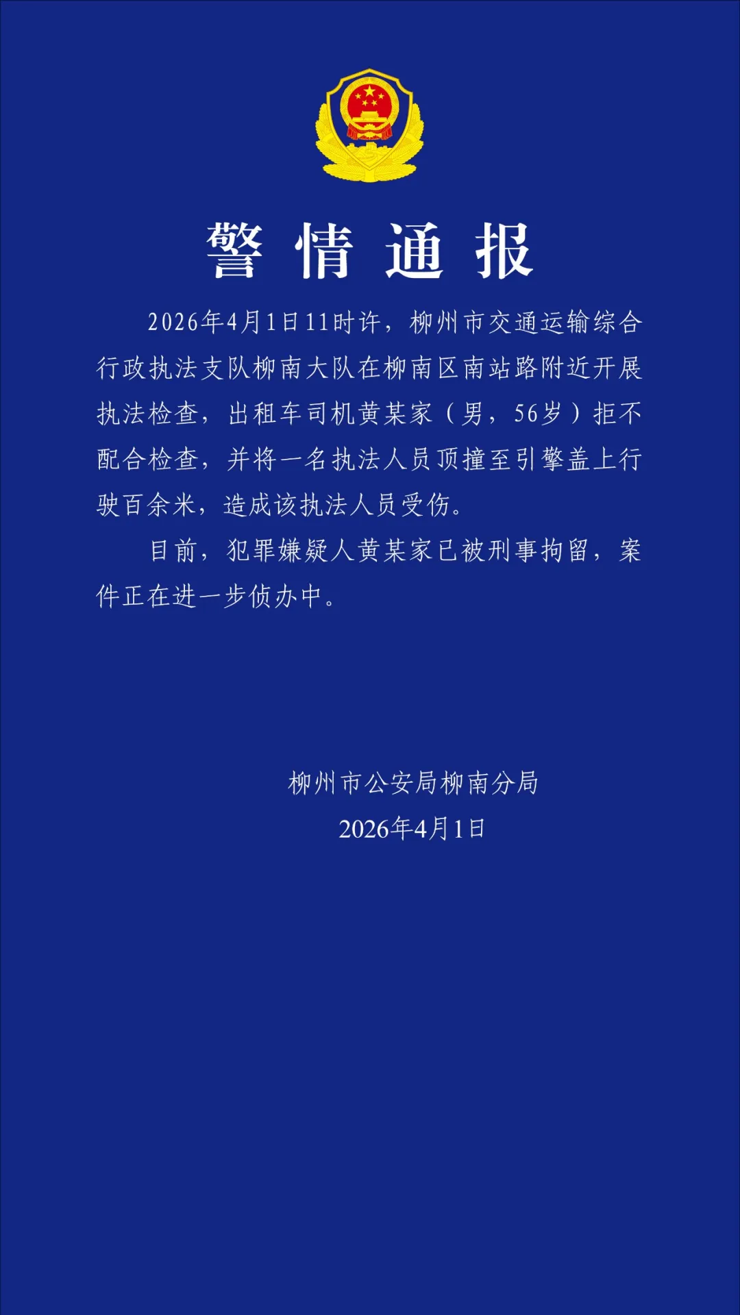 柳州市公安局柳南分局4月1日晚通报:2026年4月1日11时许,柳州市交通运输综合行政执法支队柳南大队在柳南区南站路附近开展执法检查,出租车司机黄某家(男,56岁)拒不配合检查,并将一名执法人员顶撞至引擎盖上行驶百余米,造成该执法人员受伤。目前,犯罪嫌疑人黄某家已被刑事拘留,案件正在进一步侦办中。