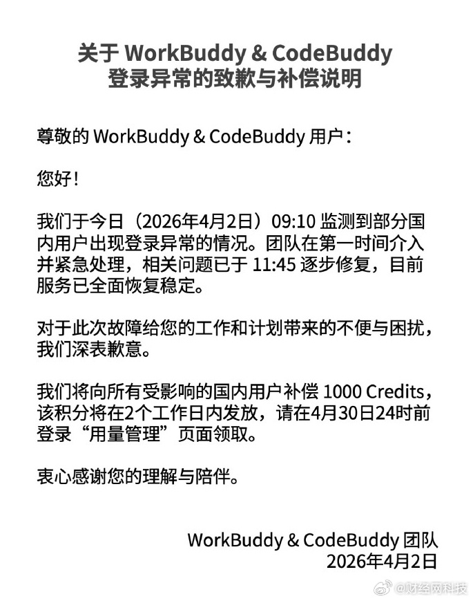 4月2日,发文:今天上午部分用户登录异常,目前已全部恢复。给大家添麻烦了,我们将为受影响用户补偿1000Credits。表示:很抱歉,因为Workbuddy登录异常,给大家的工作和计划带来不便与困扰。目前已全部恢复,我们将向所有受影响的用户直接补偿1000Credits,该积分将自动充入账户。再次向大家致歉