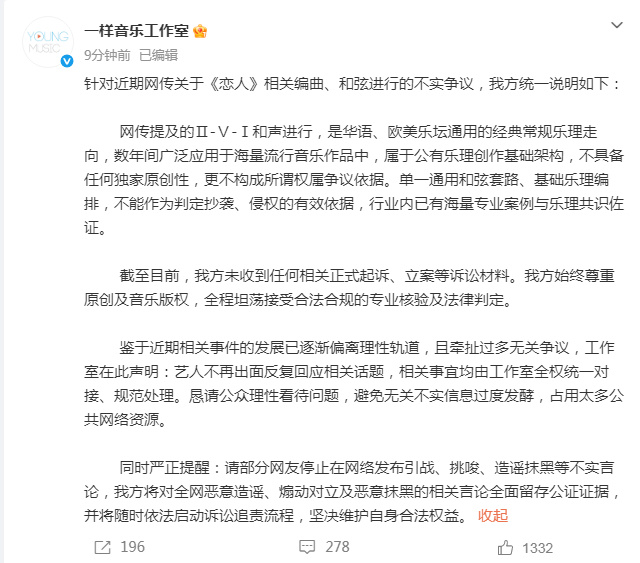 4月2日,据红星新闻:据@一样音乐工作室 :针对近期网传关于《恋人》相关编曲、和弦进行的不实争议,我方统一说明如下:网传提及的Ⅱ-Ⅴ-Ⅰ和声进行,是华语、欧美乐坛通用的经典常规乐理走向,数年间广泛应用于海量流行音乐作品中,属于公有乐理创作基础架构,不具备任何独家原创性,更不构成所谓权属争议依据。单一通用和弦套路、基础乐理编排,不能作为判定抄袭、侵权的有效依据,行业内已有海量专业案例与乐理共识佐证。