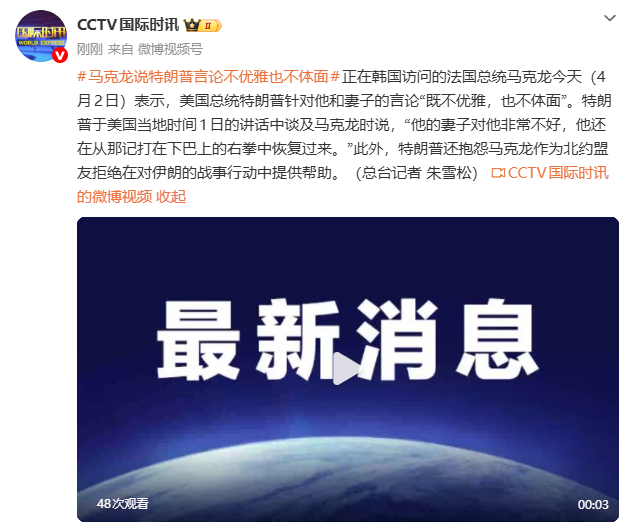 正在韩国访问的法国总统马克龙今天(4月2日)表示,美国总统特朗普针对他和妻子的言论“既不优雅,也不体面”。