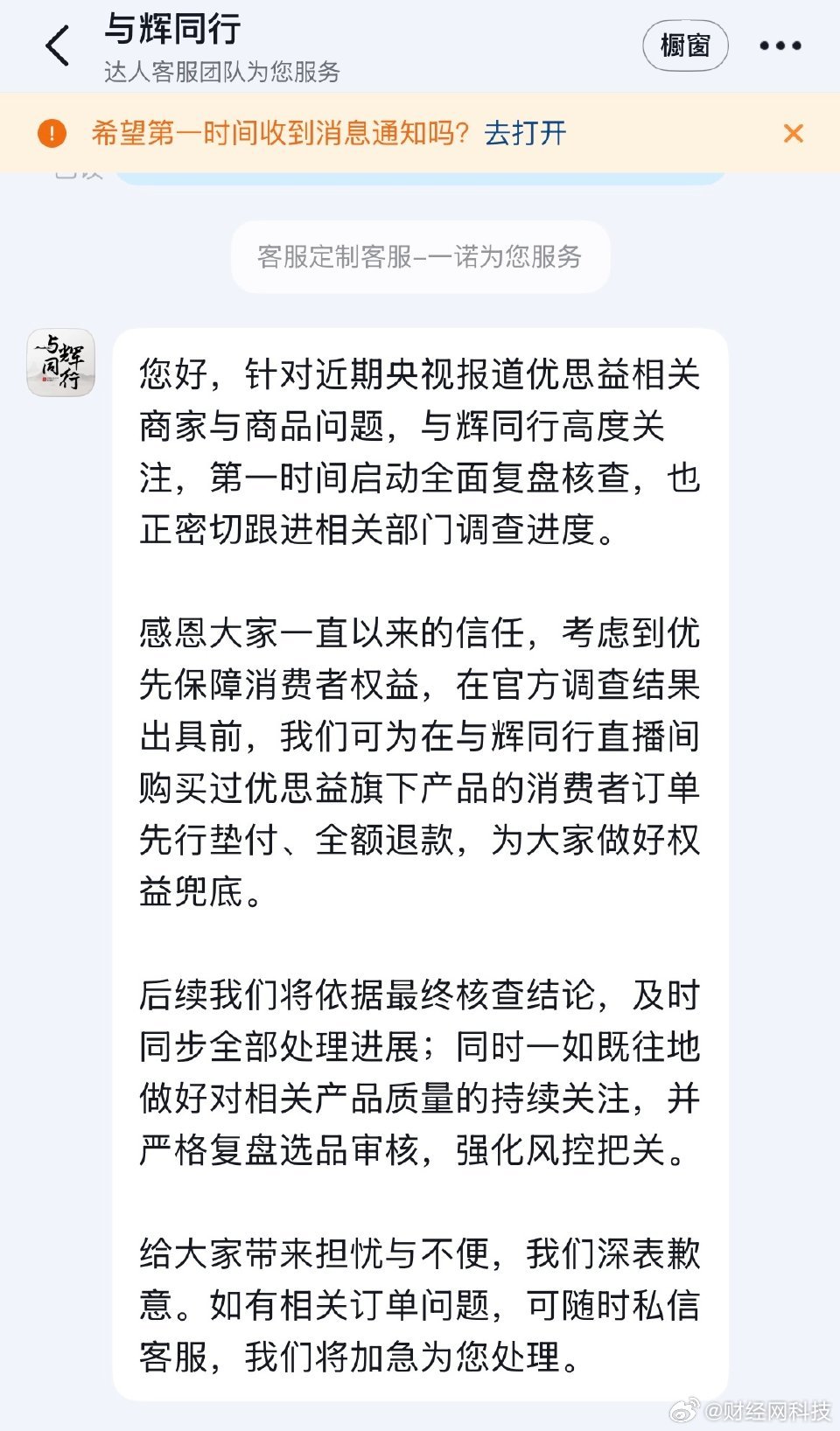 4月2日,客服表示:针对近期央视报道优思益相关商家与商品问题,与辉同行高度关注,第一时间启动全面复盘核查,也正密切跟进相关部门调查进度。感恩大家一直以来的信任,考虑到优先保障消费者权益,在官方调查结果出具前,我们可为在与辉同行直播间购买过优思益旗下产品的消费者订单先行垫付全额退款,为大家做好权益兜底。后续我们将依据最终核查结论,及时同步全部处理进展,同时一如既往地做好对相关产品质量的持续关注,并严格复盘选品审核,强化风控把关。给大家带来担忧与不便,我们深表歉意。