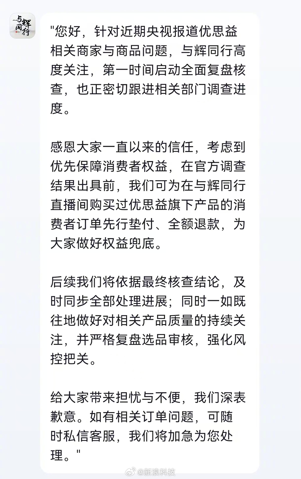 针对带货产品优思益被央视打假一事,与辉同行客服回应新浪科技称,针对近期央视报道优思益相关商家与商品问题,与辉同行高度关注,第一时间启动全面复盘核查,也正密切跟进相关部门调查进度。与辉同行方面表示,考虑到优先保障消费者权益,在官方调查结果出具前,我们可为在与辉同行直播间购买过优思益旗下产品的消费者订单先行垫付、全额退款,为大家做好权益兜底。后续我们将依据最终核查结论,及时同步全部处理进展,同时一如既往地做好对相关产品质量的持续关注,并严格复盘选品审核,强化风控把关。与辉同行方面表示,给大家带来担忧与不便,我们深表歉意。新浪科技