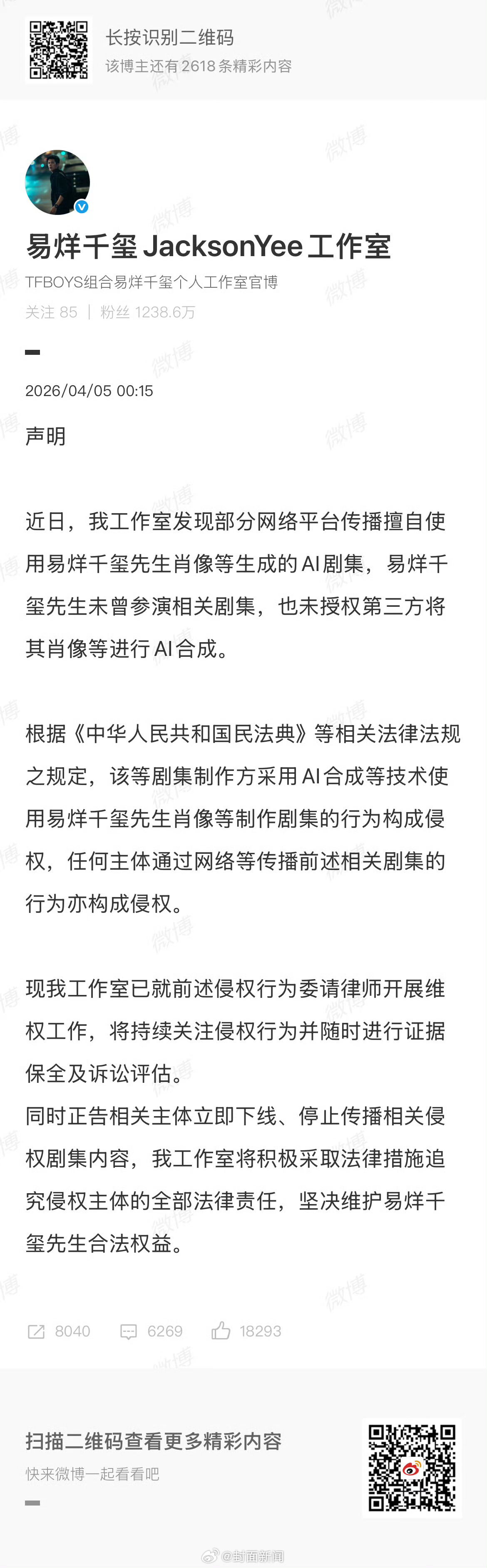 近期,某短剧平台多部AI生成短剧被曝未经许可使用AI换脸技术,伪造易烊千玺的肖像及声音用于角色创作,并进行商业变现。对此,发声明:近日,我工作室发现部分网络平台传播擅自使用易烊千玺先生肖像等生成的AI剧集,易烊千玺先生未曾参演相关剧集,也未授权第三方将其肖像等进行AI合成。根据《中华人民共和国民法典》等相关法律法规之规定,该等剧集制作方采用AI合成等技术使用易烊千玺先生肖像等制作剧集的行为构成侵权,任何主体通过网络等传播前述相关剧集的行为亦构成侵权。