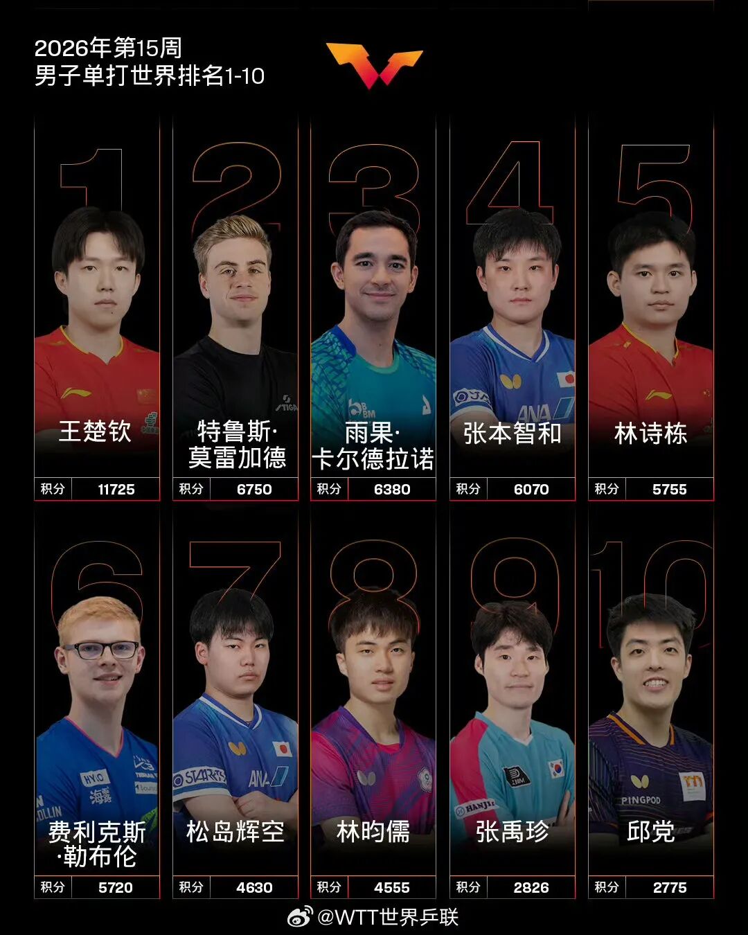 4月6日,@WTT世界乒联公布国际乒联2026年第15周世界排名。男子单打方面,中国队球员王楚钦位列第一,林诗栋位列第五。澳门世界杯男单亚军松岛辉空排名上升1个名次,位列第7;八强艾利克斯·勒布伦排名上升3个名次,位列第11;八强达科·约奇克排名上升3个名次,位列第13;十六强邱党排名上升1个名次,位列第10;十六强张禹珍排名上升1个名次,位列第9;十六强温瑞博排名上升3个名次,位列第14,刷新个人职业生涯排名新高;十六强户上隼辅排名上升4个名次,位列第18。其他中国队球员,梁靖崑排名第15,向鹏排名第17,周启豪排名第23,陈垣宇排名第24,陈俊菘排名第36,黄友政排名第50。
