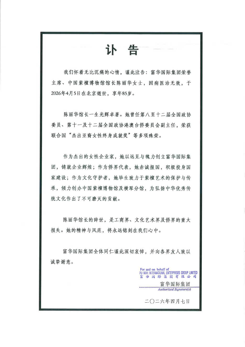 据澎湃新闻,4月7日,富华国际集团发讣告:我们怀着无比沉痛的心情,谨此泣告:富华国际集团荣誉主席、中国紫檀博物馆馆长陈丽华女士,因病医治无效,于2026年4月5日在北京逝世,享年85岁。
