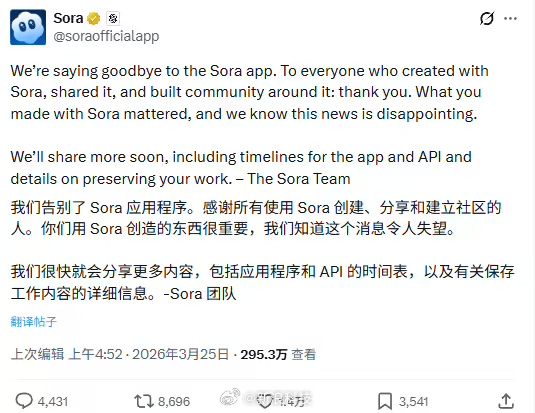 OpenAI奥特曼回应关停Sora:集中计算资源,就像GPT-3发布前那样。