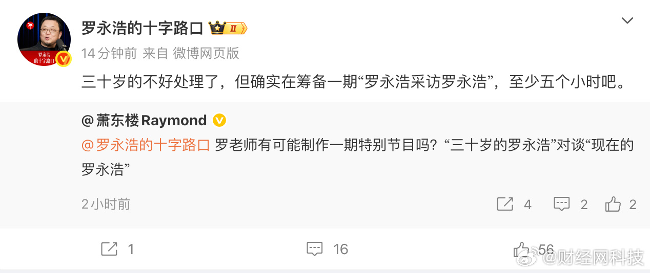 4月9日,有网友发博问:罗老师有可能制作一期特别节目吗?三十岁的罗永浩对谈现在的罗永浩,对此,罗永浩回应称三十岁的不好处理了,但确实在筹备一期罗永浩采访罗永浩,至少五个小时吧。随后该网友再次评论称那可太期待了呀。