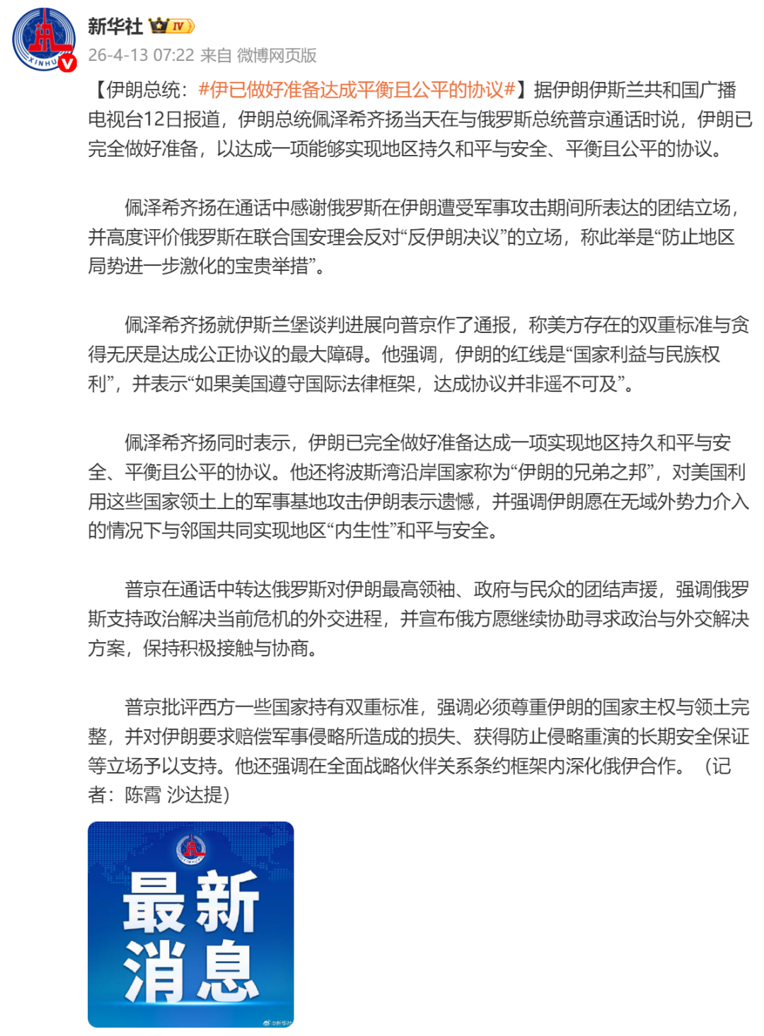 据新华社援引伊朗伊斯兰共和国广播电视台12日报道,伊朗总统佩泽希齐扬当天在与俄罗斯总统普京通话时说,伊朗已完全做好准备,以达成一项能够实现地区持久和平与安全、平衡且公平的协议。佩泽希齐扬在通话中感谢俄罗斯在伊朗遭受军事攻击期间所表达的团结立场,并高度评价俄罗斯在联合国安理会反对“反伊朗决议”的立场,称此举是“防止地区局势进一步激化的宝贵举措”。