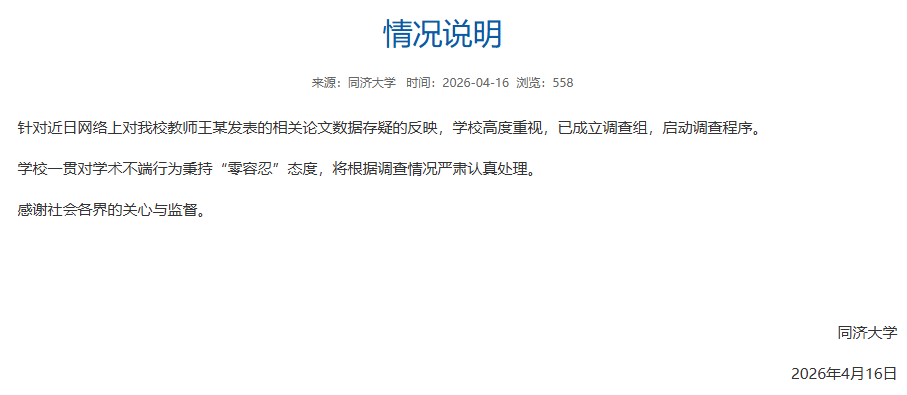 4月16日,同济大学发布情况通报: 针对近日网络上对我校教师王某发表的相关论文数据存疑的反映,学校高度重视,已成立调查组,启动调查程序。学校一贯对学术不端行为秉持“零容忍”态度,将根据调查情况严肃认真处理。感谢社会各界的关心与监督。