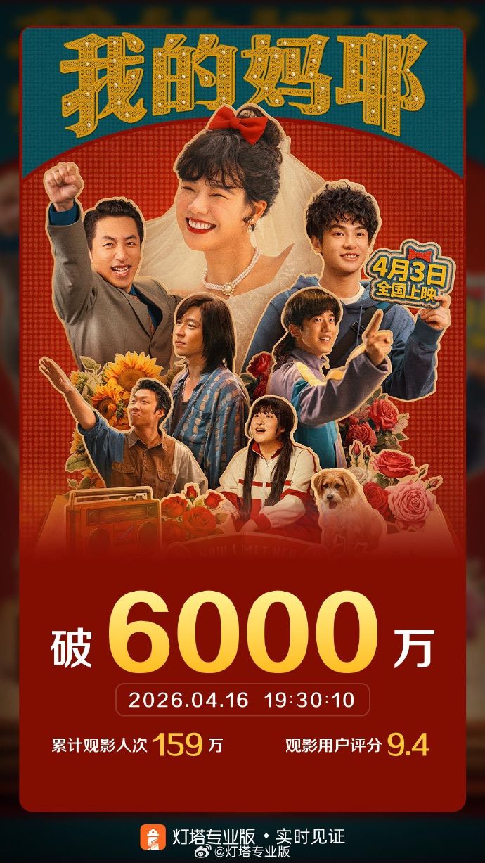 灯塔专业版实时数据显示,电影《我的妈耶》票房于4月16日19时30分突破6000万元。该数据反映了影片上映后的市场表现。票房成绩是衡量电影商业成功的重要指标。6000万的票房数字表明该片获得了观众认可。