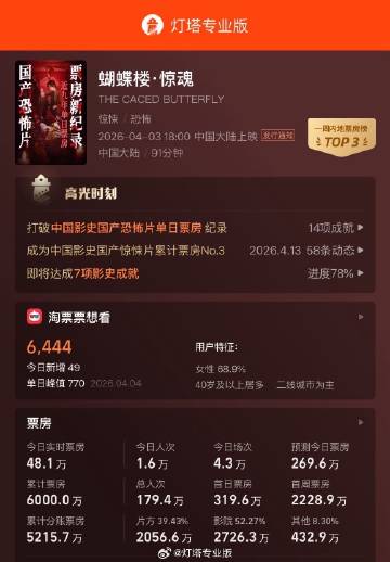 灯塔专业版实时数据显示,电影《蝴蝶楼·惊魂》票房于4月17日12时42分突破6000万元。该数据反映了影片上映后的市场表现。票房成绩是衡量电影商业成功的重要指标之一。6000万元的票房里程碑标志着该片进入当前档期的热门影片行列。