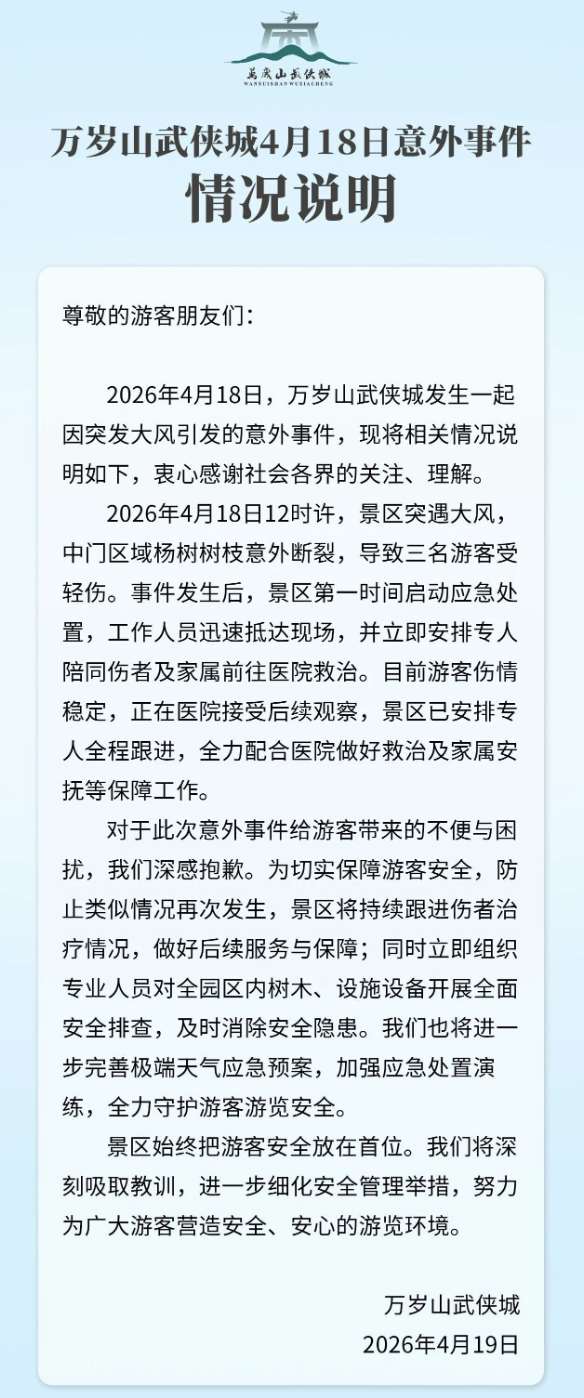 4月19日,万岁山武侠城发布情况说明:4月18日,河南开封万岁山武侠城景区内一棵树断裂,砸到多名游客。有游客拍到的现场视频显示,有3名游客躺倒在地,旁边有断裂的树干、树枝。有游客称,现场有游客头部受伤。视频中还有人大声询问“有没有学过急救的游客?”