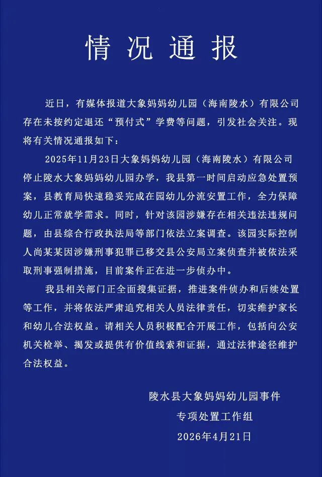 4月21日,海南陵水县大象妈妈幼儿园事件专项处置工作组发布情况通报:近日,有媒体报道大象妈妈幼儿园(海南陵水)有限公司存在未按约定退还“预付式”学费等问题,引发社会关注。2025年11月23日大象妈妈幼儿园(海南陵水)有限公司停止陵水大象妈妈幼儿园办学,我县第一时间启动应急处置预案,县教育局快速稳妥完成在园幼儿分流安置工作,全力保障幼儿正常就学需求。同时,针对该园涉嫌存在相关违法违规问题,由县综合行政执法局等部门依法立案调查。该园实际控制人尚某某因涉嫌刑事犯罪已移交县公安局立案侦查并被依法采取刑事强制措施,目前案件正在进一步侦办中。