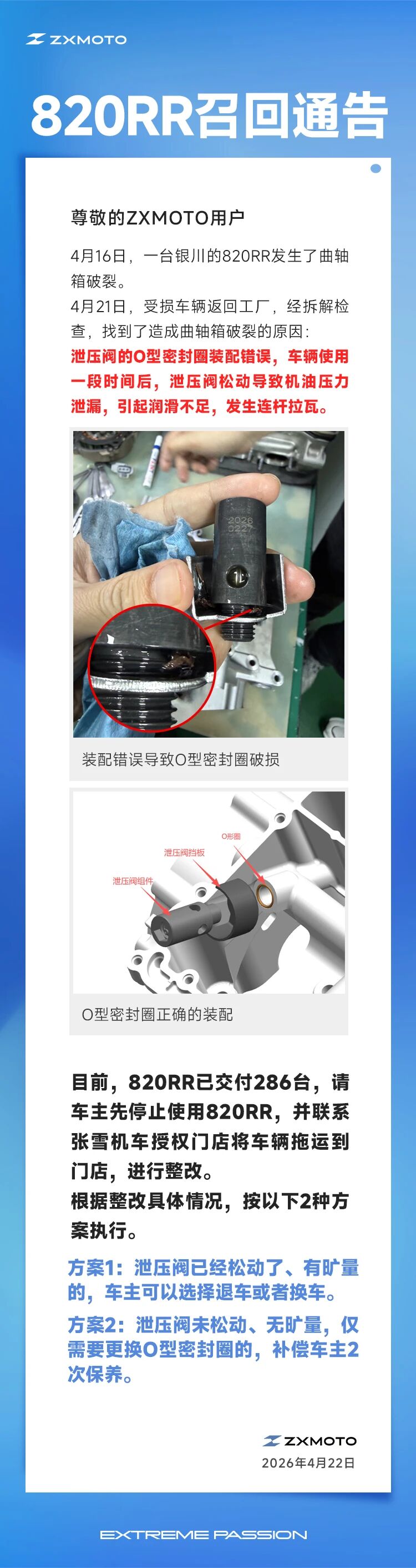 4月22日,张雪机车发布820RR召回通告。通告称,4月16日,一台银川的820RR发生了曲轴箱破裂。4月21日,受损车辆返回工厂,经拆解检查,找到了造成曲轴箱破裂的原因:泄压阀的O型密封圈装配错误,车辆使用一段时间后,泄压阀松动导致机油压力泄漏,引起润滑不足,发生连杆拉瓦。目前,820RR已交付286台,请车主先停止使用820RR,并联系张雪机车授权门店将车辆拖运到门店,进行整改。
