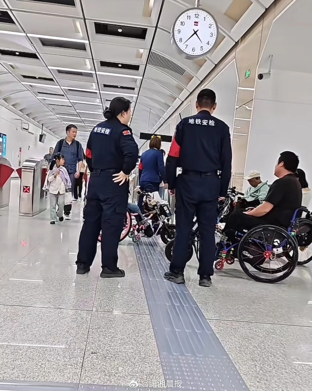近日,陕西西安,王女士和同伴坐着电动轮椅进地铁站遇安检人员检查,过程持续近一小时,相关事件在网络上引发热议。4月27日,王女士告诉晨视频记者,4月25日他们一行7人坐着轮椅,刚逛完一场招聘会进入地铁站准备回家。他们拿残疾证换了地铁票,过完安检等待工作人员放行进站,可是安检人员要求检查他们的轮椅合格证。王女士说,她的轮椅买得比较久,贴在轮椅上的合格标识已经被她扣掉了。她当天来招聘会也是坐地铁来的,那会儿就没有遇阻。