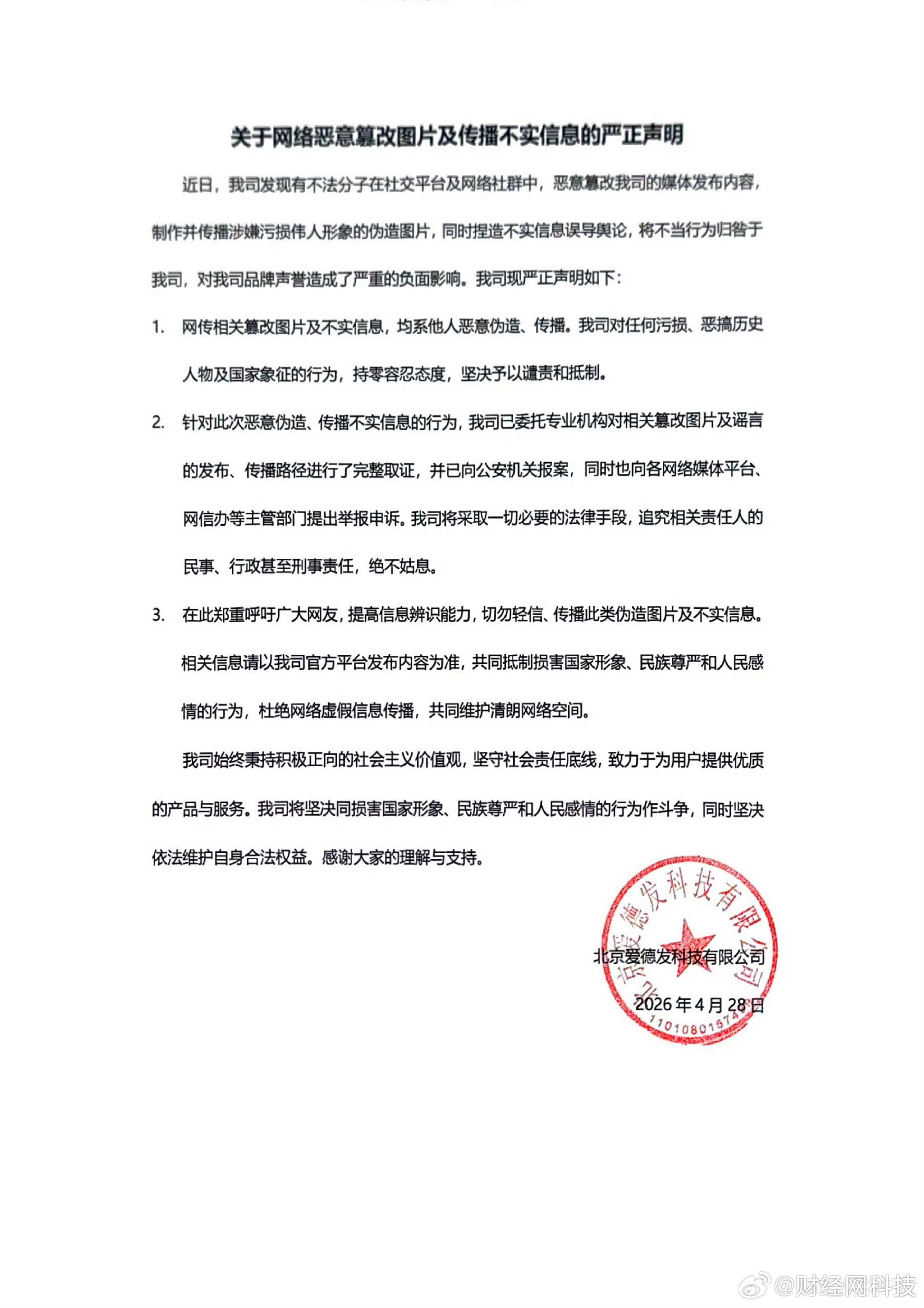 2.针对此次恶意伪造传播不实信息的行为,我司已委托专业机构对相关篡改图片及谣言的发布传播路径进行了完整取证,并已向公安机关报案,同时也向各网络媒体平台网信办等主管部门提出举报申诉。我司将采取一切必要的法律手段,追究相关责任人的民事行政甚至刑事责任,绝不姑息。3.在此郑重呼吁广大网友,提高信息辨识能力,切勿轻信传播此类伪造图片及不实信息。相关信息请以我司官方平台发布内容为准,共同抵制损害国家形象民族尊严和人民感情的行为,杜绝网络虚假信息传播,共同维护清朗网络空间。我司始终秉持积极正向的社会主义价值观,坚守社会责任底线,致力于为用户提供优质的产品与服务。我司将坚决同损害国家形象民族尊严和人民感情的行为作斗争,同时坚决依法维护自身合法权益。感谢大家的理解与支持