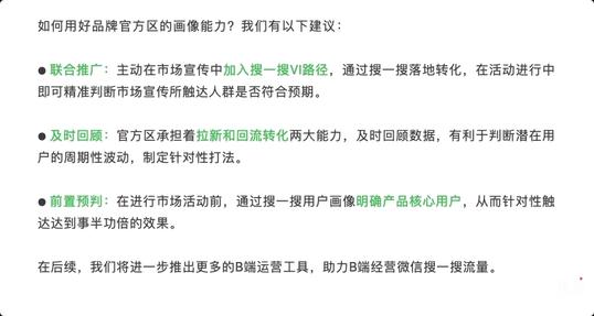 你的品牌谁在搜?微信搜一搜用户画像能力开放。 10月21日消息,微信搜一搜品牌官方区首次开放“用户画像“能力,提供人口属性、地域分布和设备分布三大核心数据,帮助品牌主精准锁定潜在用户。查看方式:登陆mp端->微信搜一搜->品牌官方区->数据概览。后续将进一步在搜一搜商户助手小程序开放。