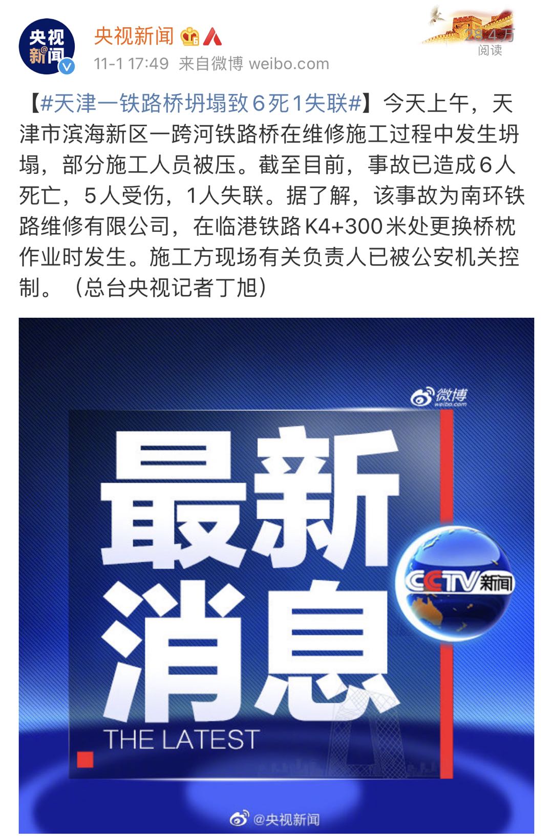 今天上午9时许,天津南环铁路桥梁维修过程中发生坍塌事故。截至目前,事故共造成6人死亡,5人受伤,1人失联,失联人员正在搜救中。