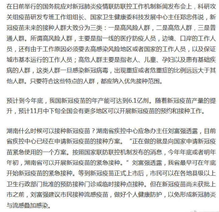 湖南省疾控中心:湖南最早年底开始新冠疫苗紧急接种。