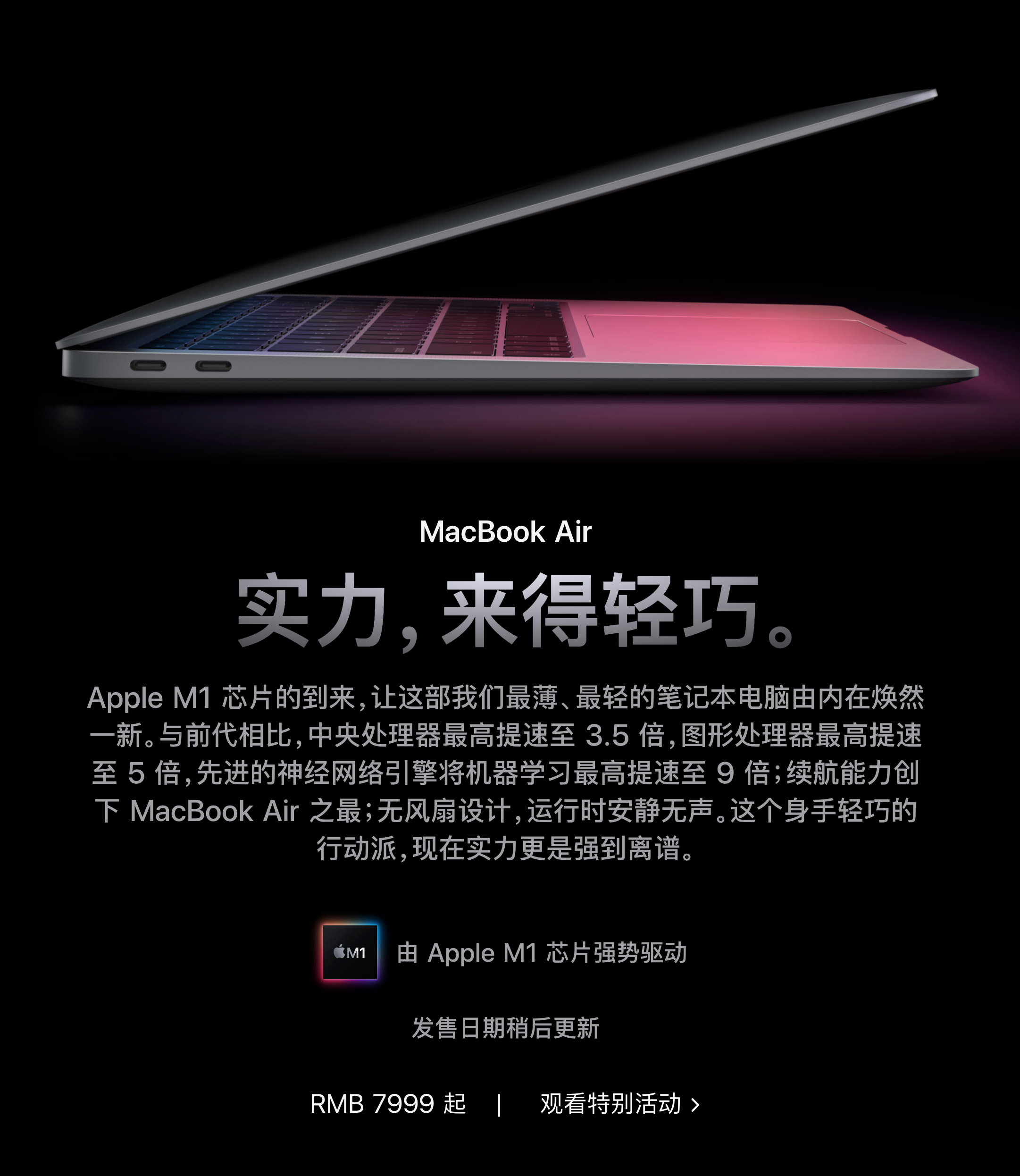 苹果发布搭载自研芯片的MacBook Air:性能提升,还有超长续航。