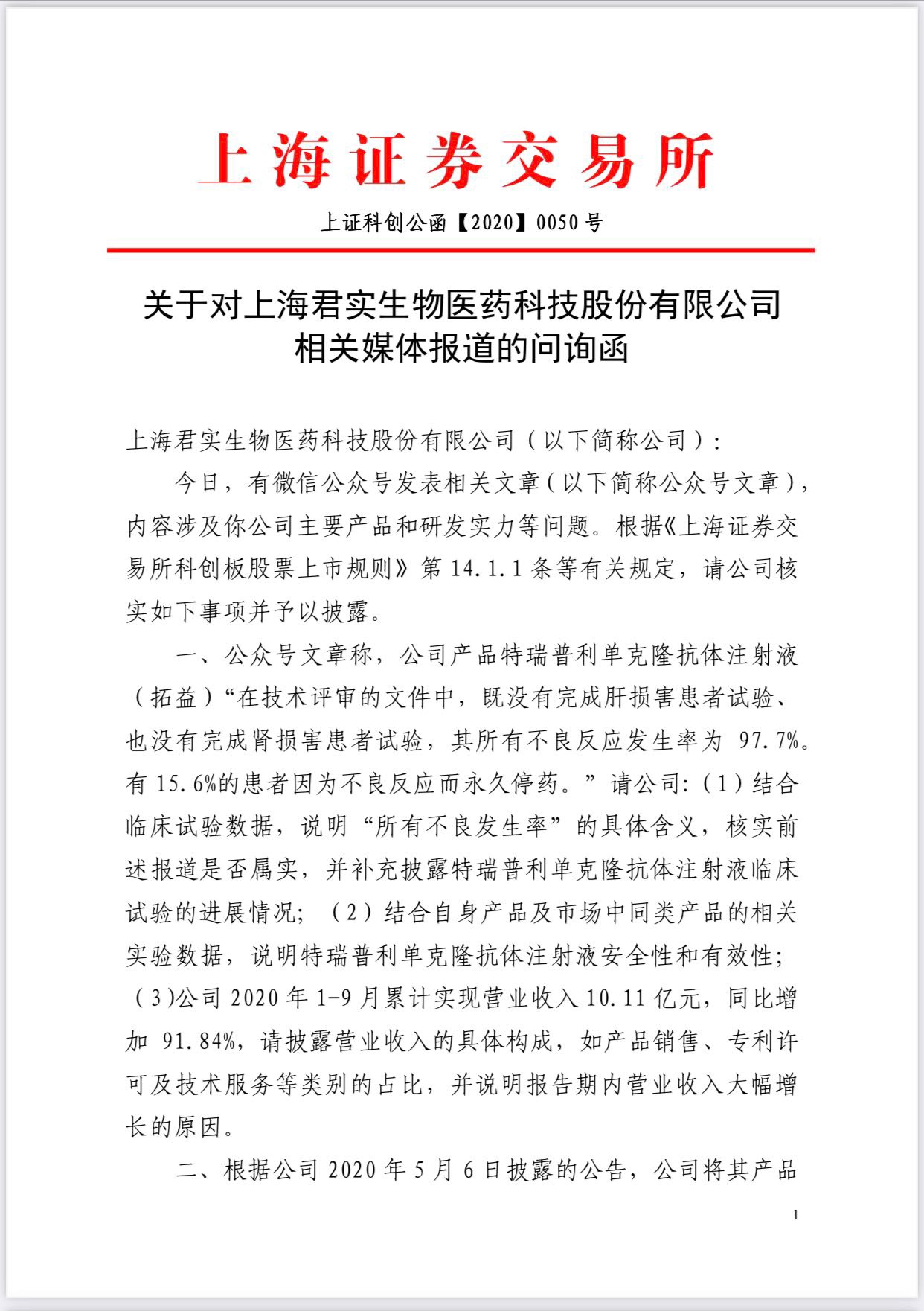 君实生物收问询函,要求就微信公众号所涉内容做出说明。