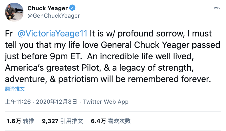 第一个突破音障的人类、飞行员耶格尔去世,享年97岁。
