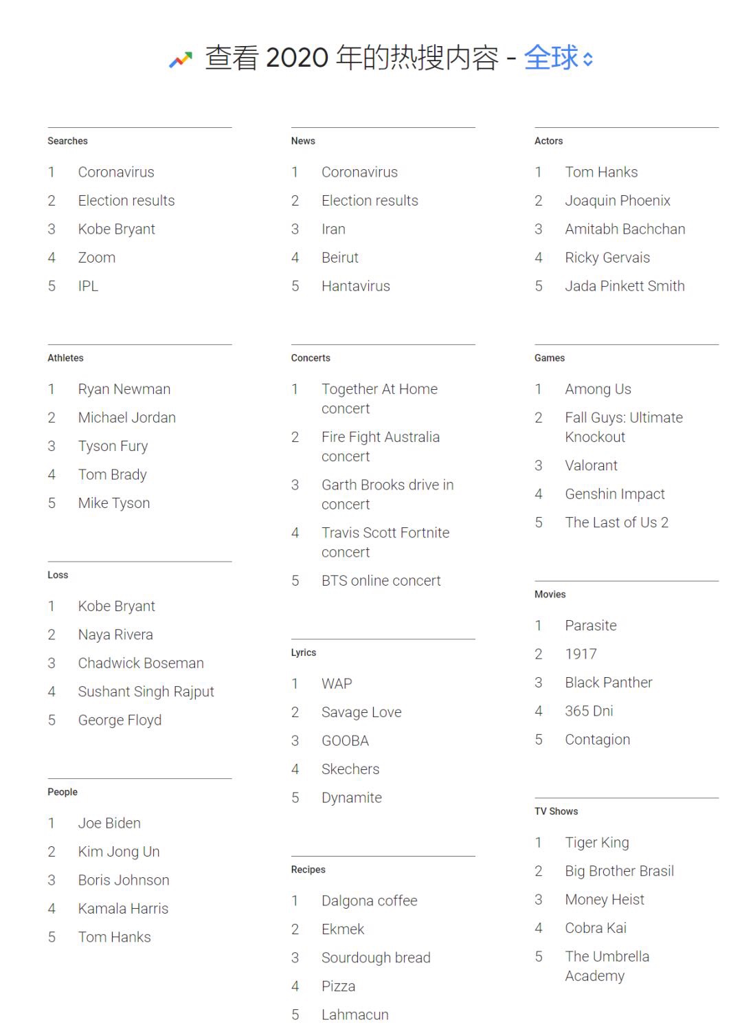 美国当选总统拜登成为本年度谷歌搜索次数最多的人。据《福布斯》网站9日报道,根据谷歌当天公布的2020年度热搜榜,拜登荣登人物趋势榜榜首,成为本年度最热门的搜索人物。报道称,拜登的搜索量在11月1日至11月7日期间达到峰值,这一周正值美国大选。