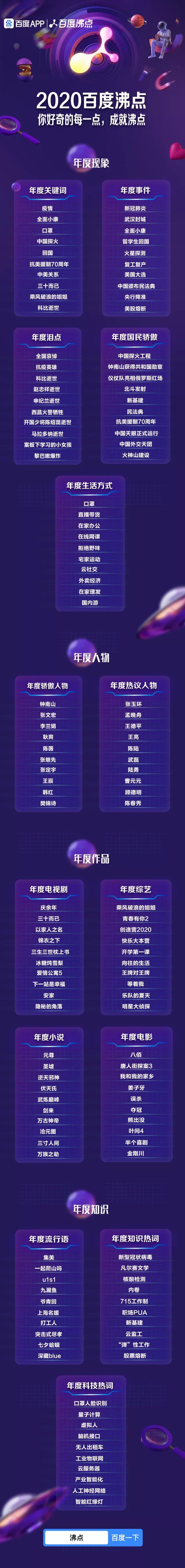 12月14日,2020百度沸点年度榜单正式出炉。2020百度沸点发布了年度现象(包括年度关键词、年度事件、年度泪点、年度国民骄傲榜、年度生活方式)、年度人物(包括年度骄傲人物、年度热议人物)、年度作品(年度电视剧、年度综艺、年度小说、年度电影)、年度知识(年度流行语、年度知识热词、年度科技热词)在内的4个系列共14个榜单,再一次以大数据的方式盘点了中国网民在过去一年关注的各种热点。