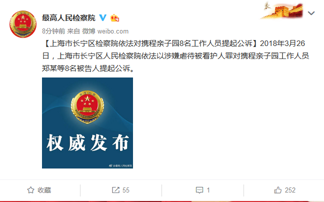 携程亲子园虐童事件进展:8名被告被诉。来自最高人民检察院消息,上海市长宁区人民检察院今天(3月26日)依法以涉嫌虐待被看护人罪对携程亲子园工作人员郑某等8名被告人提起公诉。#这件事你们还有印象吗?8名被告被诉,你们满意了不?