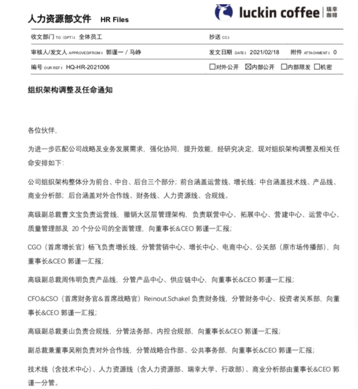瑞幸组织架构调整:将设置前台中台和后台,新任命均向郭谨一汇报。