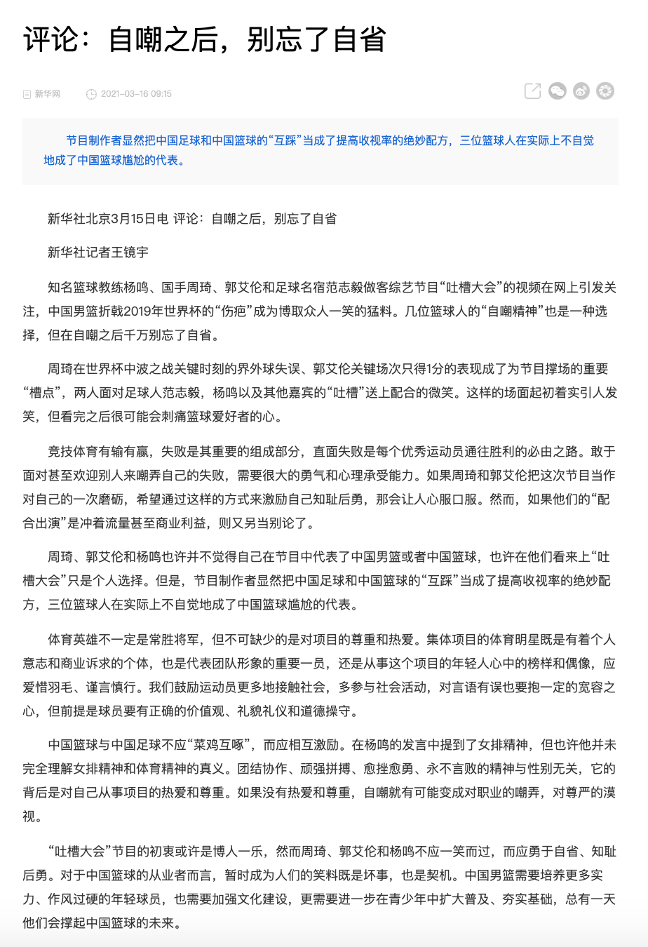 新华社评论:自嘲之后别忘自省,中国篮球与中国足球不应“菜鸡互啄”。