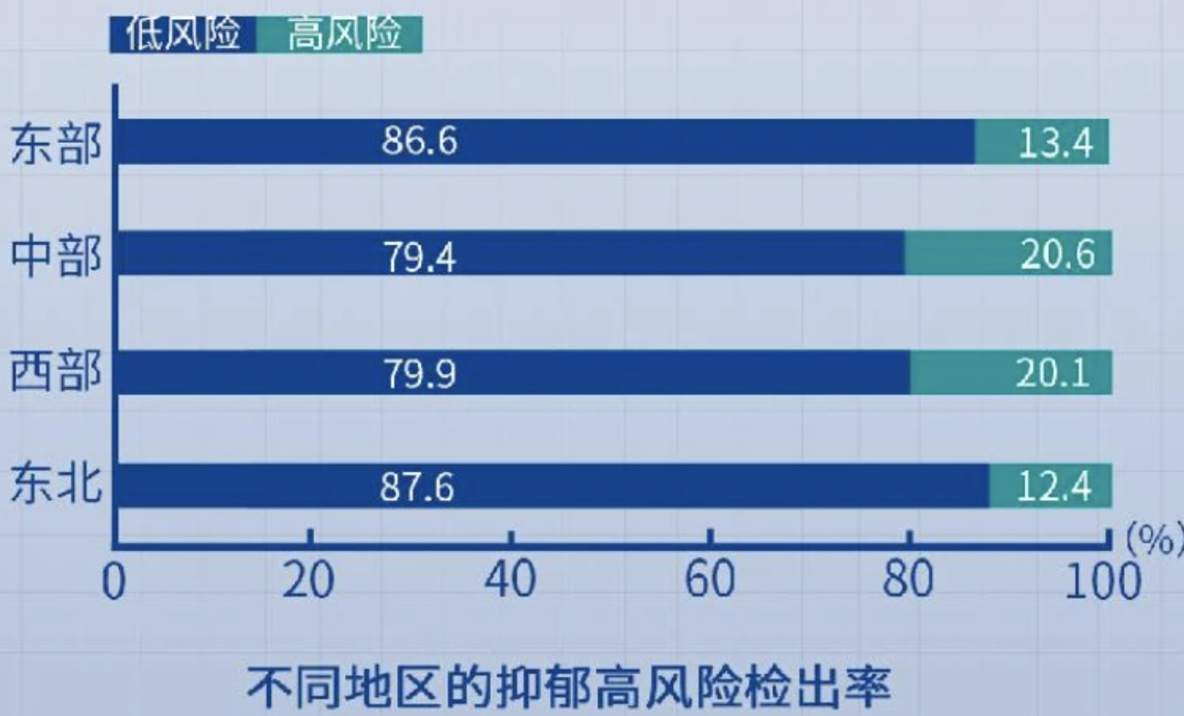 另外,学历越高,心理健康水平越高,特别是大学本科及以上学历人群的心理健康水平高于更低学历人群,其中高中及以下学历人群抑郁高风险的检出率为18.1%,比大学本科及以上人群高出近5个百分点。