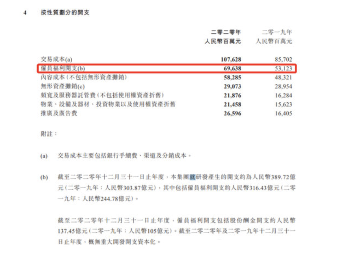腾讯发布2020年业绩,业绩中,腾讯公布了2020年薪酬情况,其中,雇员福利开支696.38亿元,去年同期531.23亿元,员工人数从去年的62885名增加到85858名。以此计算,腾讯员工人均年薪从2019年的84.48万元减少到2020年的81.11万元。