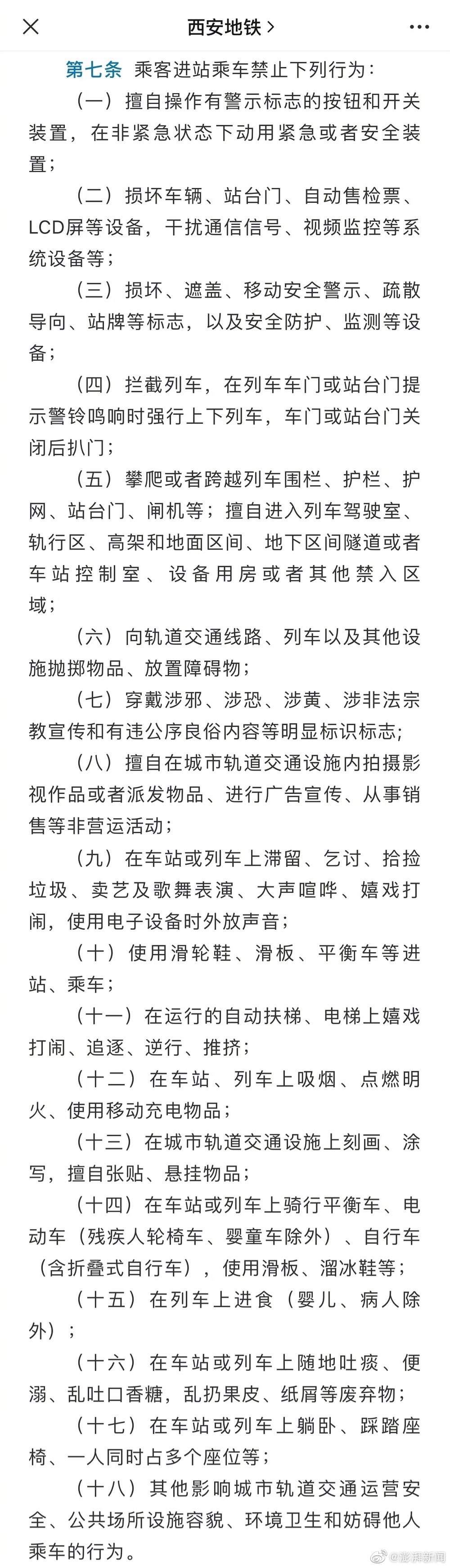 西安市交通运输局日前公布《西安市城市轨道交通乘客守则(征求意见稿)》,即日起至4月1日公开征求意见。其中最受关注的,当属拟禁止“在车站、列车上吸烟、点燃明火、使用移动充电物品”。