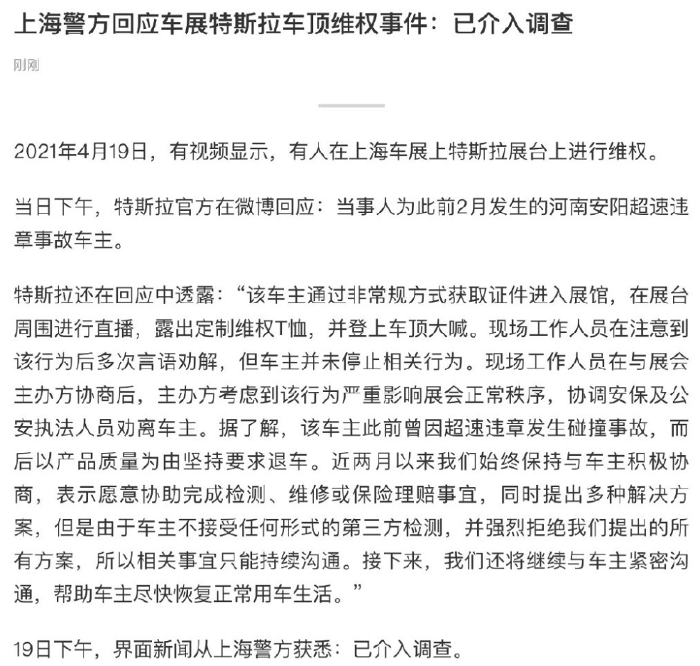 4月19日,据界面,针对特斯拉车展遭维权事件,上海警方处透露,已介入调查。