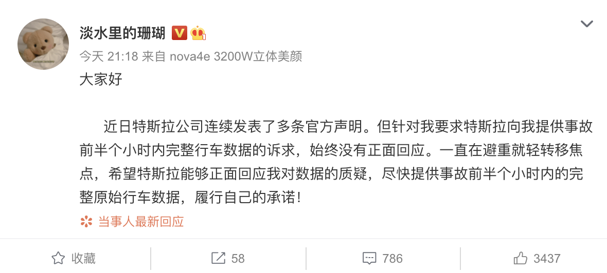 特斯拉维权女车主@淡水里的珊瑚 发微博称,近日特斯拉公司连续发表了多条官方声明。但针对我要求特斯拉向我提供事故前半个小时内完整行车数据的诉求,始终没有正面回应。一直在避重就轻转移焦点,希望特斯拉能够正面回应我对数据的质疑,尽快提供事故前半个小时内的完整原始行车数据,履行自己的承诺!