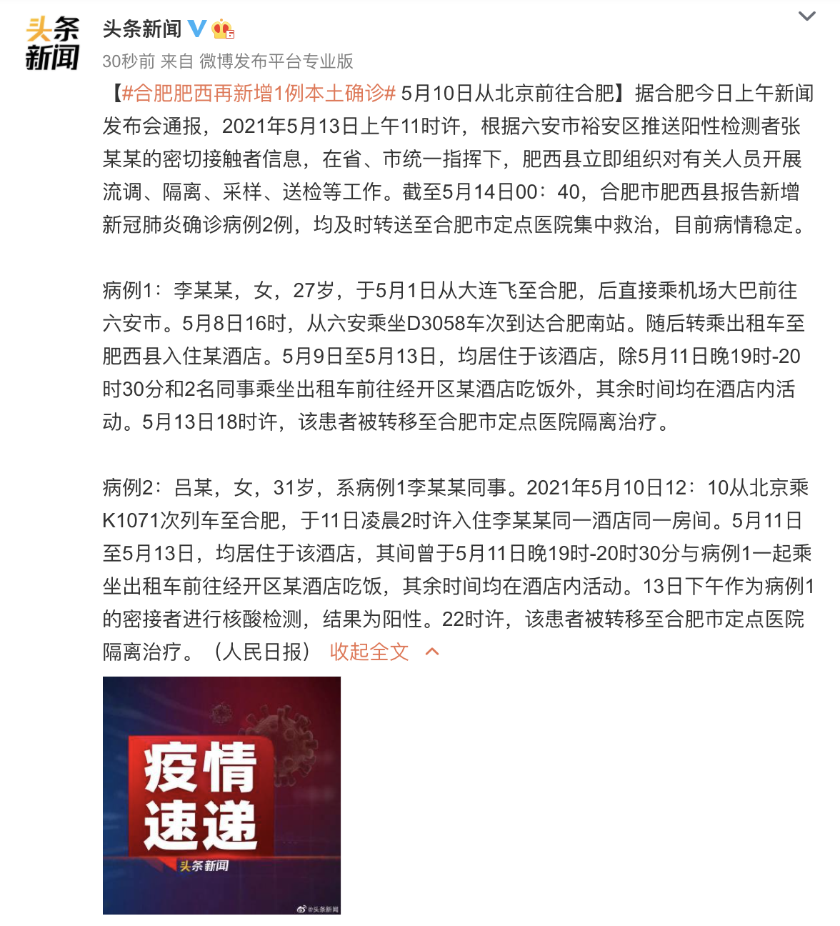 安徽合肥肥西县再增1例本土确诊,系此前病例李某某同事。