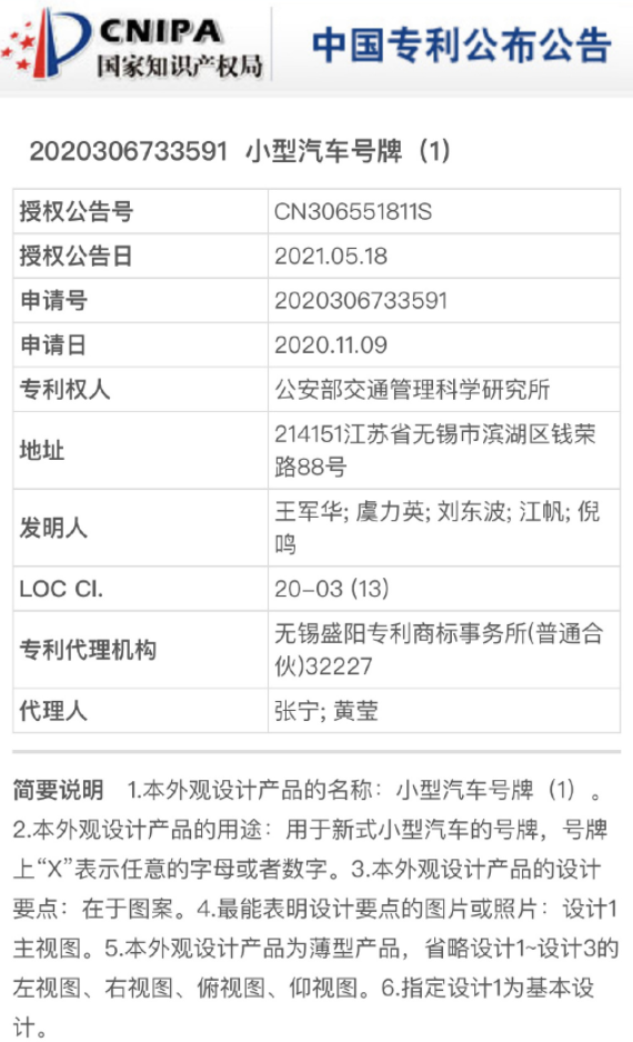 据国家知识产权局网站,公安部交通管理科学研究所申请小型汽车号牌外观设计专利,用于新式小型汽车的号牌,号牌上“X”表示任意的字母或者数字。
