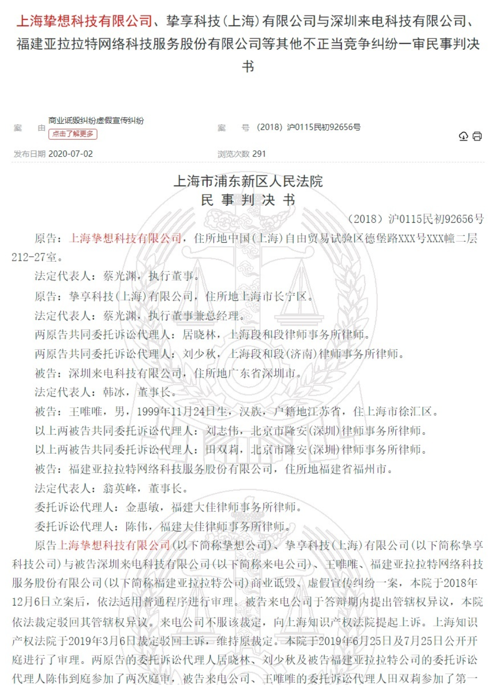 6月24日,记者从中国裁判文书网公开的两则民事判决书中获悉,日前,这起商业诋毁、虚假宣传纠纷案获得终审判决:被告深圳来电科技有限公司需赔偿原告上海挚想科技有限公司、挚享科技(上海)有限公司12万元;并在报纸上刊登声明、消除影响。