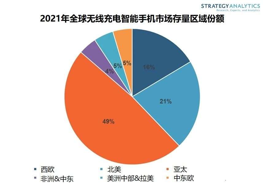 据Strategy Analytics,到2021年底,具备无线充电功能的智能手机市场存量将达到创纪录的10亿部。数据显示,配备无线充电设备的销量在亚太地区最多,市场存量约占全球的49%;此外,北美市场的存量占21%;西欧仅占16%。