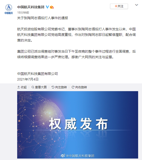 中国航天科技集团通报张陶酒后打人事件:对其作出停职决定。