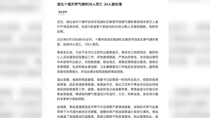 十堰天然气爆炸事故致26死138伤,34名公职人员被处理。