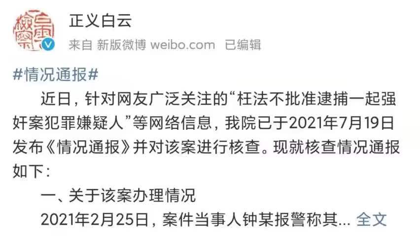 7月23日,广东广州。白云检方通报网传“不批准逮捕强奸案嫌犯”,目前在案证据不足以证明构成强奸罪,原不批准逮捕决定正确。网传“一杯奶茶就是性同意”言论信息不实。(via 七环视频)