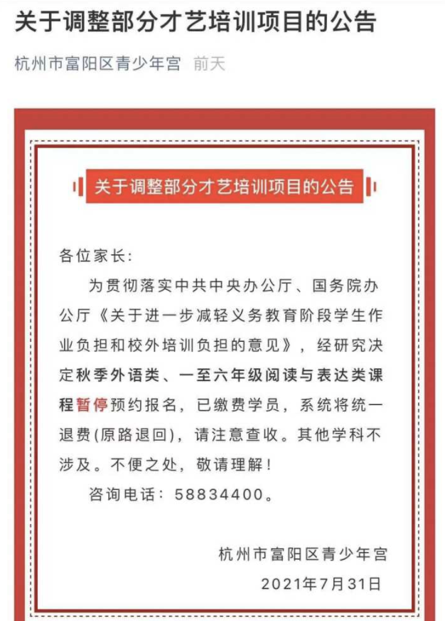 培训班开始退费,杭州已有家长收到通知。