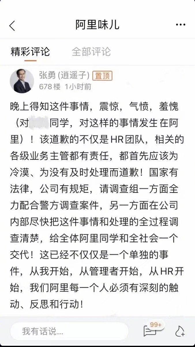 张勇在阿里内网帖子里为此事中各级主管的冷漠和没有及时处理道歉。尽管警方仍在调查阶段,但阿里内部认为,事情在员工反馈后没有得到迅速的响应处理,存在重大问题。张勇称,“从我开始,从管理者开始,我们每一个人必须有深刻的触动、反思和行动!”
