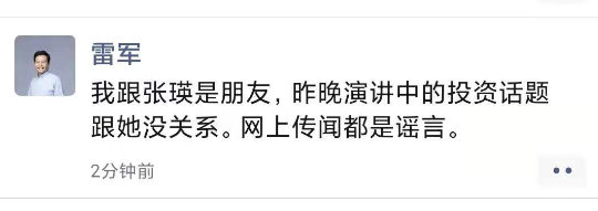 雷军:我和张瑛是朋友,演讲中的投资话题和她没关系,网上传闻都是谣言。