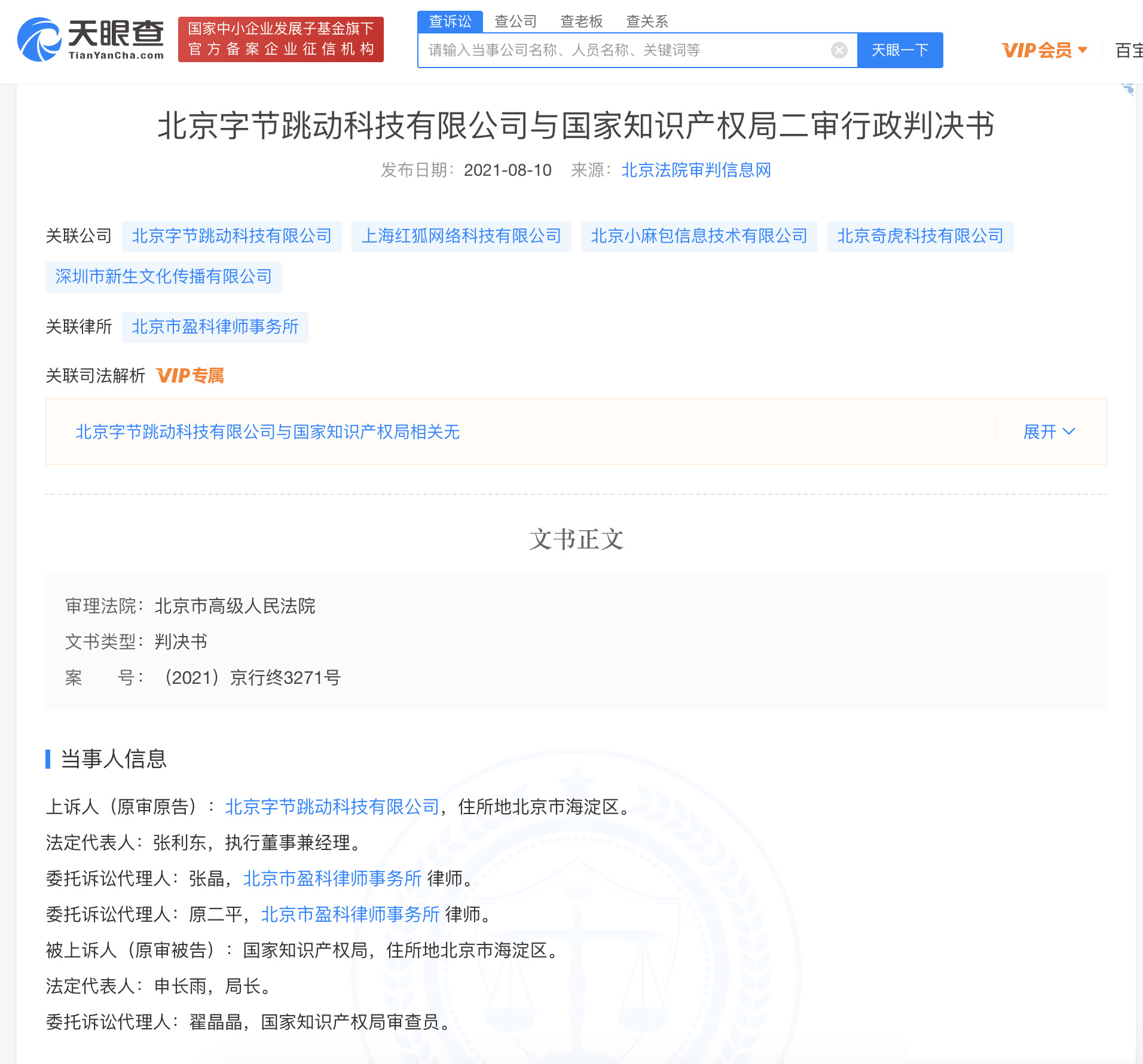 据天眼查显示,近日,北京字节跳动科技有限公司与国家知识产权局二审行政判决书公开,案号(2021)京行终3271号,审理法院为北京市高级人民法院。